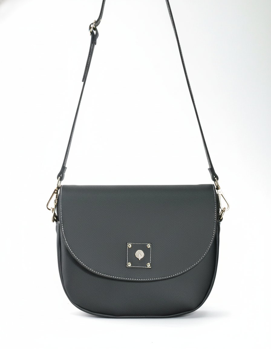 Χιαστί τσάντα πόλης από τεχνητό δέρμα με διακριτικές μεταλλικές λεπτομέρειες και χοντρό λουράκι που ρυθμίζεται στο επιθυμητό ύψος. Διαθέτει τρία εξωτερικά φερμουάρ με αντίστοιχες θήκες, καθώς και μία εσωτερική θήκη που κλείνει με φερμουάρ και θήκη κινητού. Το καπάκι κλείνει με μαγνητικό κλίπ.