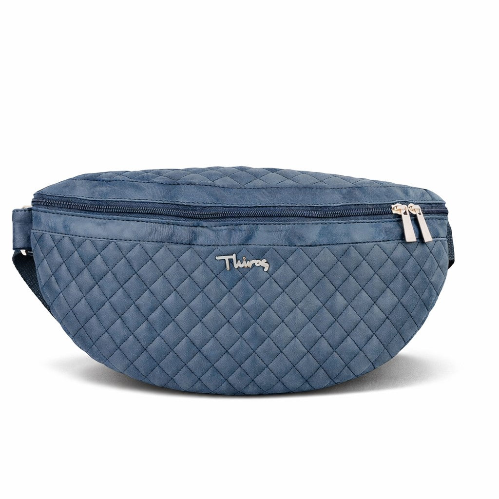 Large belt bag made of quilted artificial leather with subtle metallic details and strap. It closes with a zipper, has an outer pocket and a single interior, while the strap can be adjusted to the desired height.