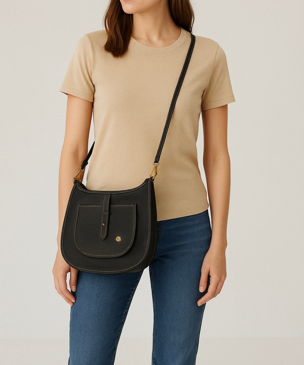 Χιαστί τσάντα πόλης από τεχνητό δέρμα με διακριτικές μεταλλικές λεπτομέρειες και χοντρό λουράκι που ρυθμίζεται στο επιθυμητό ύψος. Κλείνει με μαγνητικό κλίπ, διαθέτει ευρύχωρο εσωτερικό, και εξωτερική τσέπη που κλείνει με μαγνητικό κλίπ.