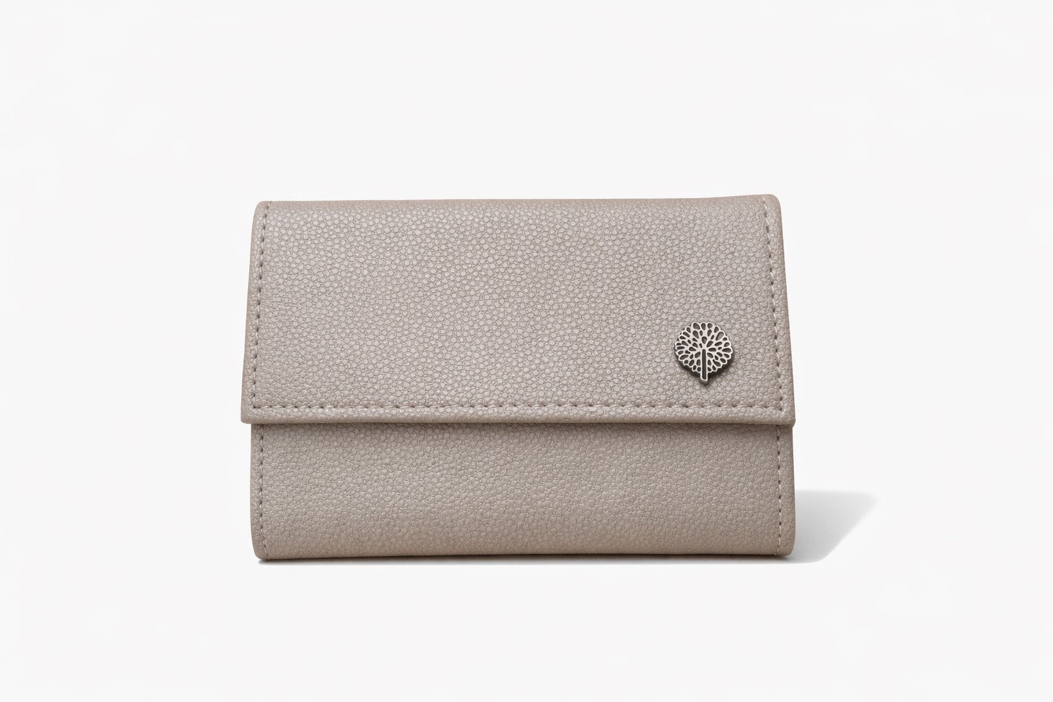 Πορτοφόλι από τεχνητό δέρμα με χρυσές λεπτομέρειες. Διαθέτει θήκες για χαρτονομίσματα, κάρτες, ταυτότητα, κέρματα και κλείνει με μαγνητικό κλιπ.