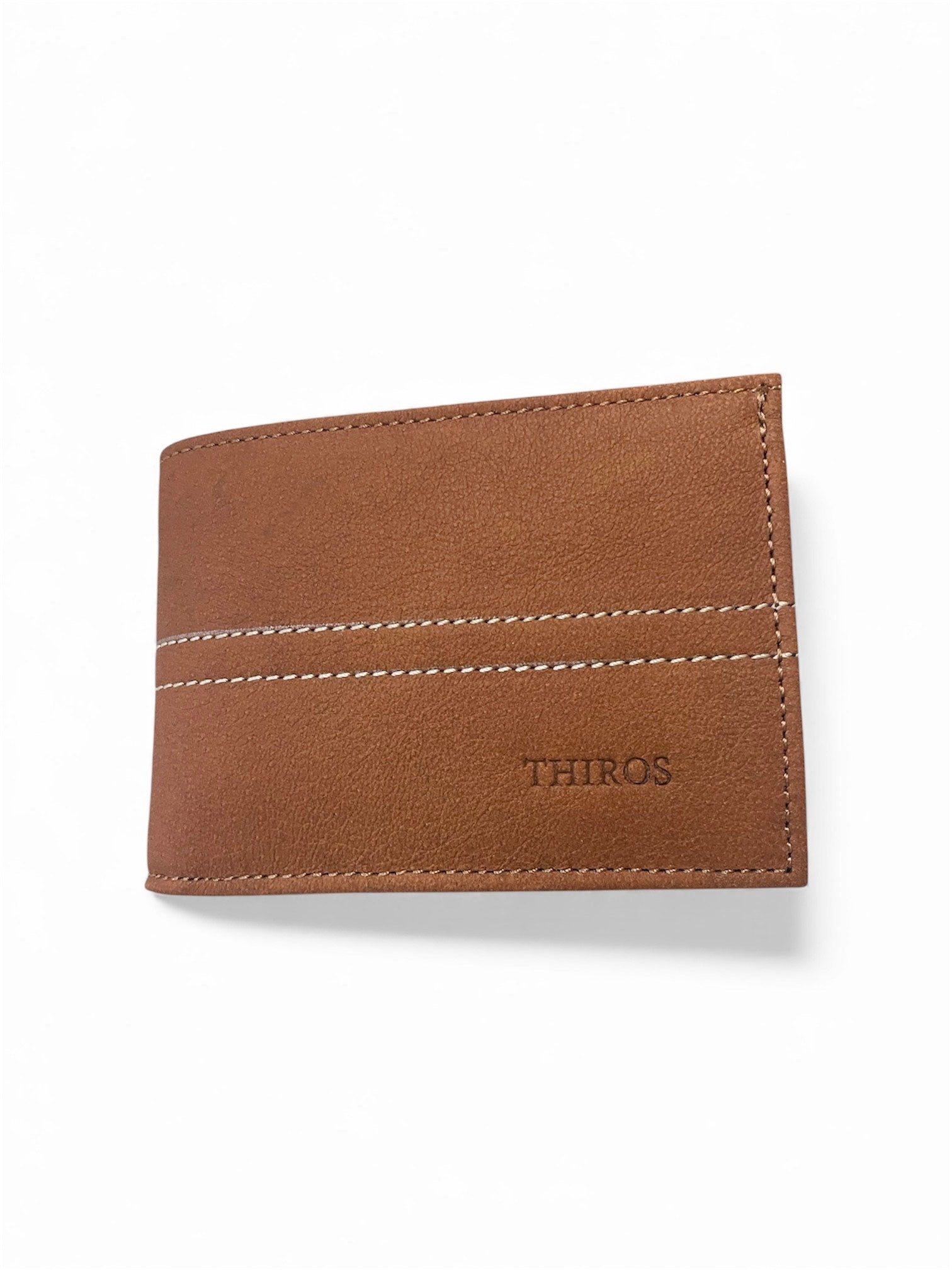 Αναδιπλώμενο πορτοφόλι από μαλακό δέρμα. Διαθέτει διπλή θήκη για χαρτονομίσματα, θήκη για κέρματα με κούμπωμα, θήκες για κάρτες, ταυτότητα και δίπλωμα.