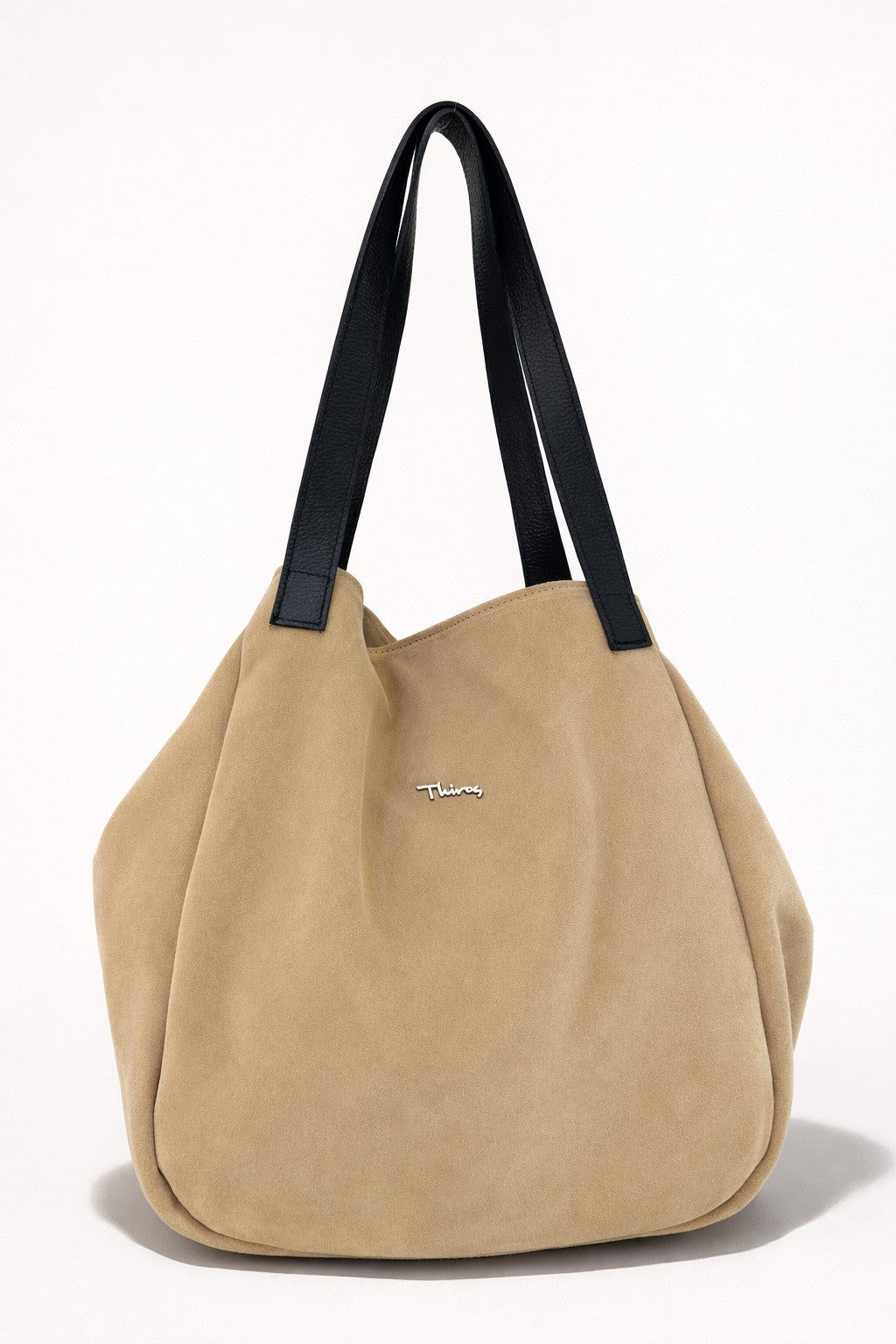 Τσάντα ώμου από suede δέρμα, το σήμα THIROS. Έχει μαύρες λεπτομέρειες. Διαθέτει ενιαίο εσωτερικό χώρο, κλείνει με μαγνητικό κλιπ και ιμάντα, έχει θήκη για το κινητό και θήκη για μικροαντικείμενα που κλείνει με φερμουάρ.