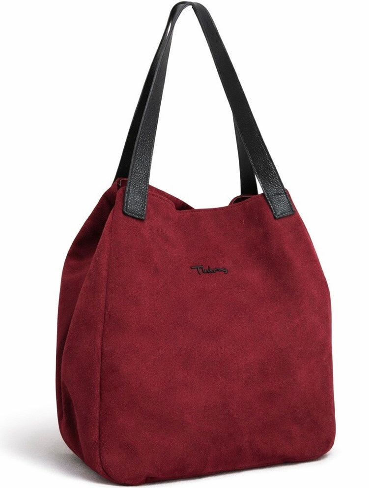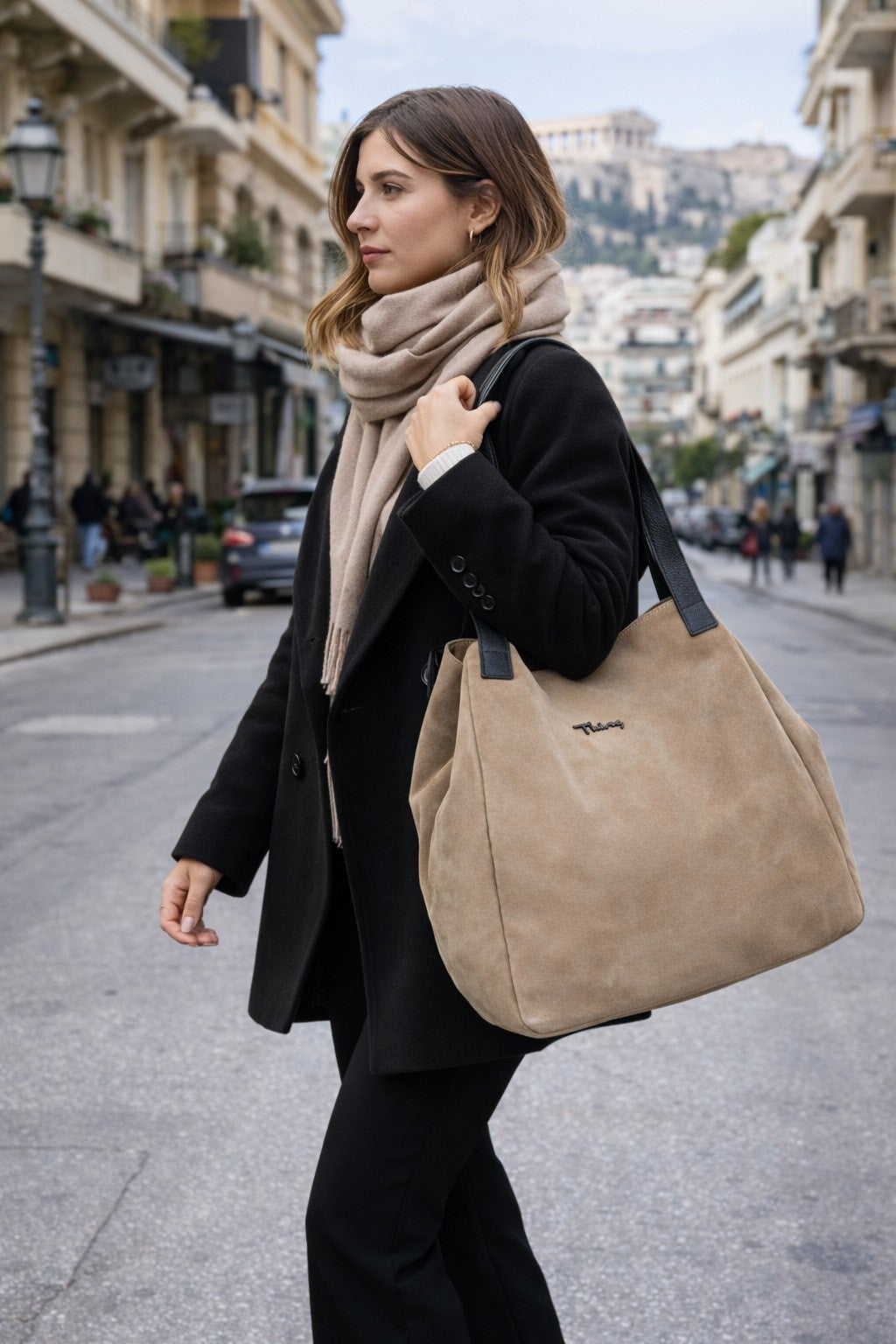 Τσάντα ώμου από suede δέρμα, το σήμα THIROS. Έχει μαύρες λεπτομέρειες. Διαθέτει ενιαίο εσωτερικό χώρο, κλείνει με μαγνητικό κλιπ και ιμάντα, έχει θήκη για το κινητό και θήκη για μικροαντικείμενα που κλείνει με φερμουάρ.
