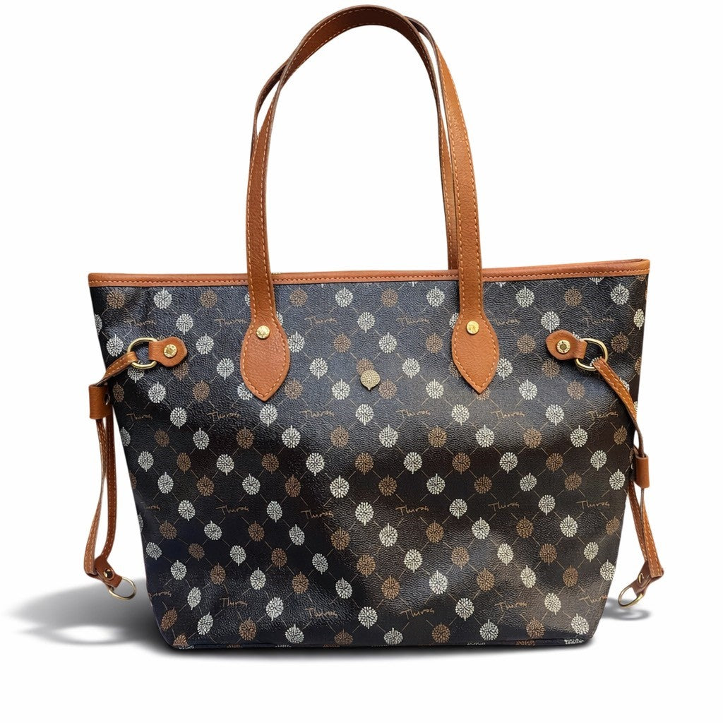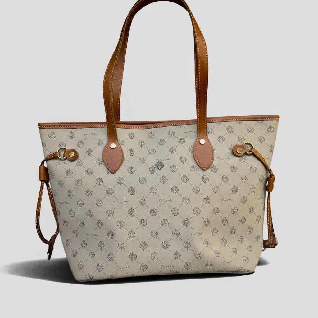 Ευρύχωρη τσάντα ώμου από τεχνητό δέρμα με το σήμα THIROS και με διακριτικές χρυσές λεπτομέρειες. Διαθέτει εσωτερική θήκη, διακοσμητικά λουράκια στο πλάι, είναι φοδραρισμένη και κλείνει με φερμουάρ.